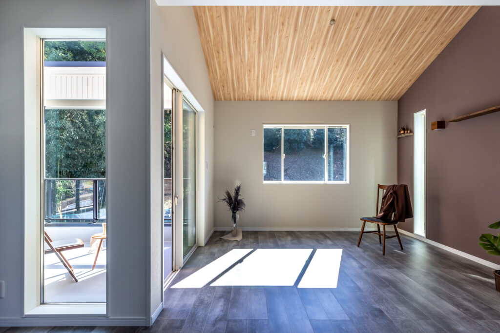 目の前に竹林が広がるロケーションを活かして、LDKと水回りを2階に配置したG邸。窓を大きくとり、竹林が見える方向にテラスを設け、外と内とのつながりを感じるアウトドアリビングを創り上げた。1階を細かく間仕切りすることで構造がより強くなり、2階に大空間を叶えているのもこの家のポイントだ。建築家と一緒につくった家は、すべてにおいて満足度のレベルが違うと実感できる一邸である。